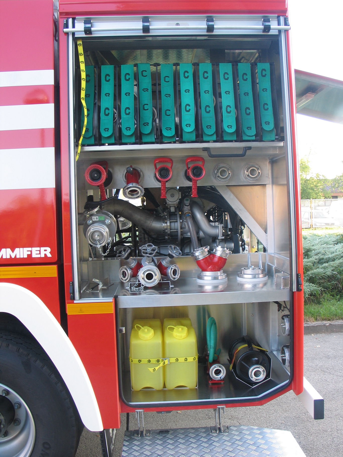 - Tank pumper is equipped with a fire extinguishing pump of normal and high pressure, one high-pressure rapid intervention hose reel with high-pressure water nozzle, and a 6.000 litres water tank located on the chassis between two compartments for firefighting equipment