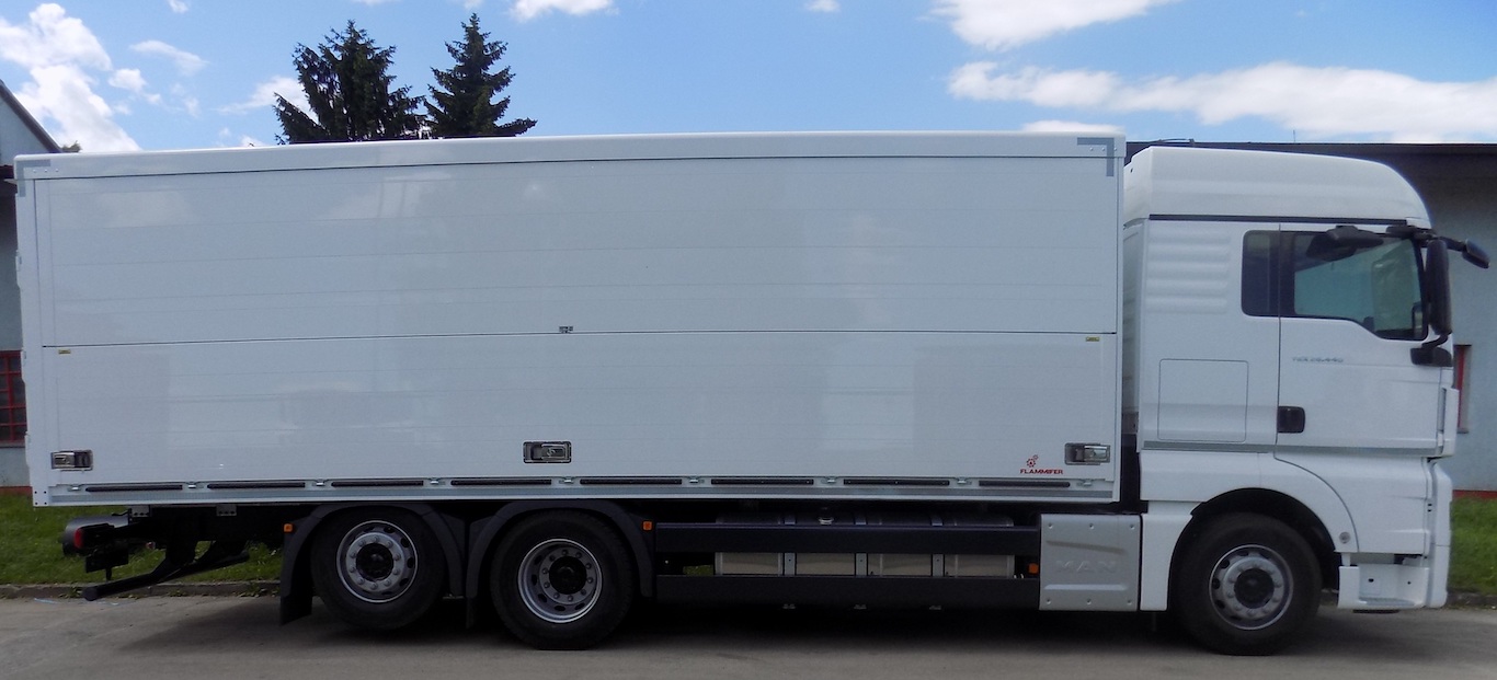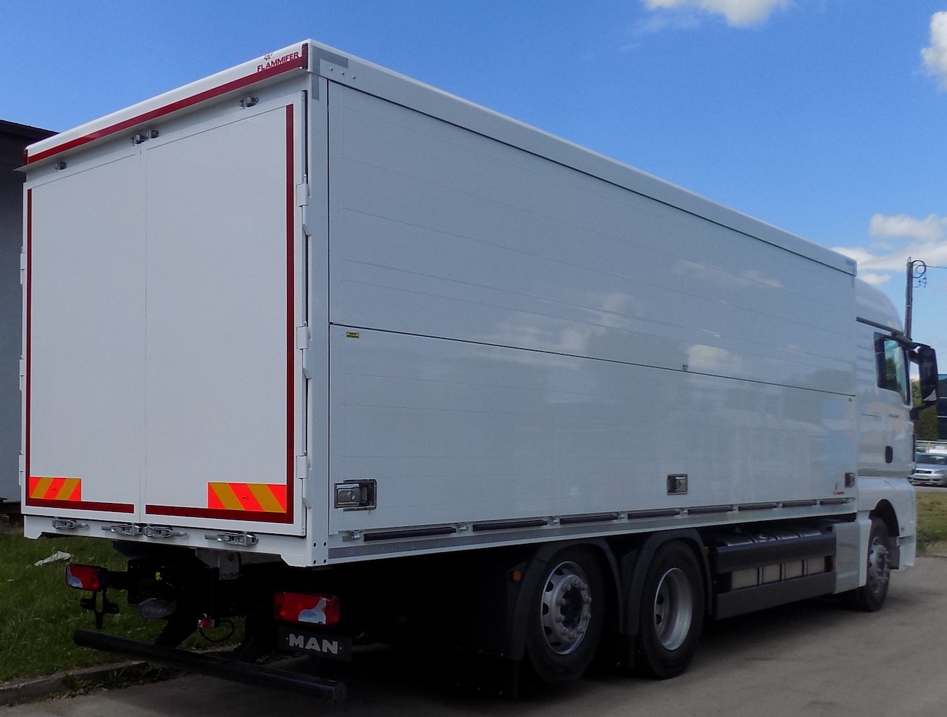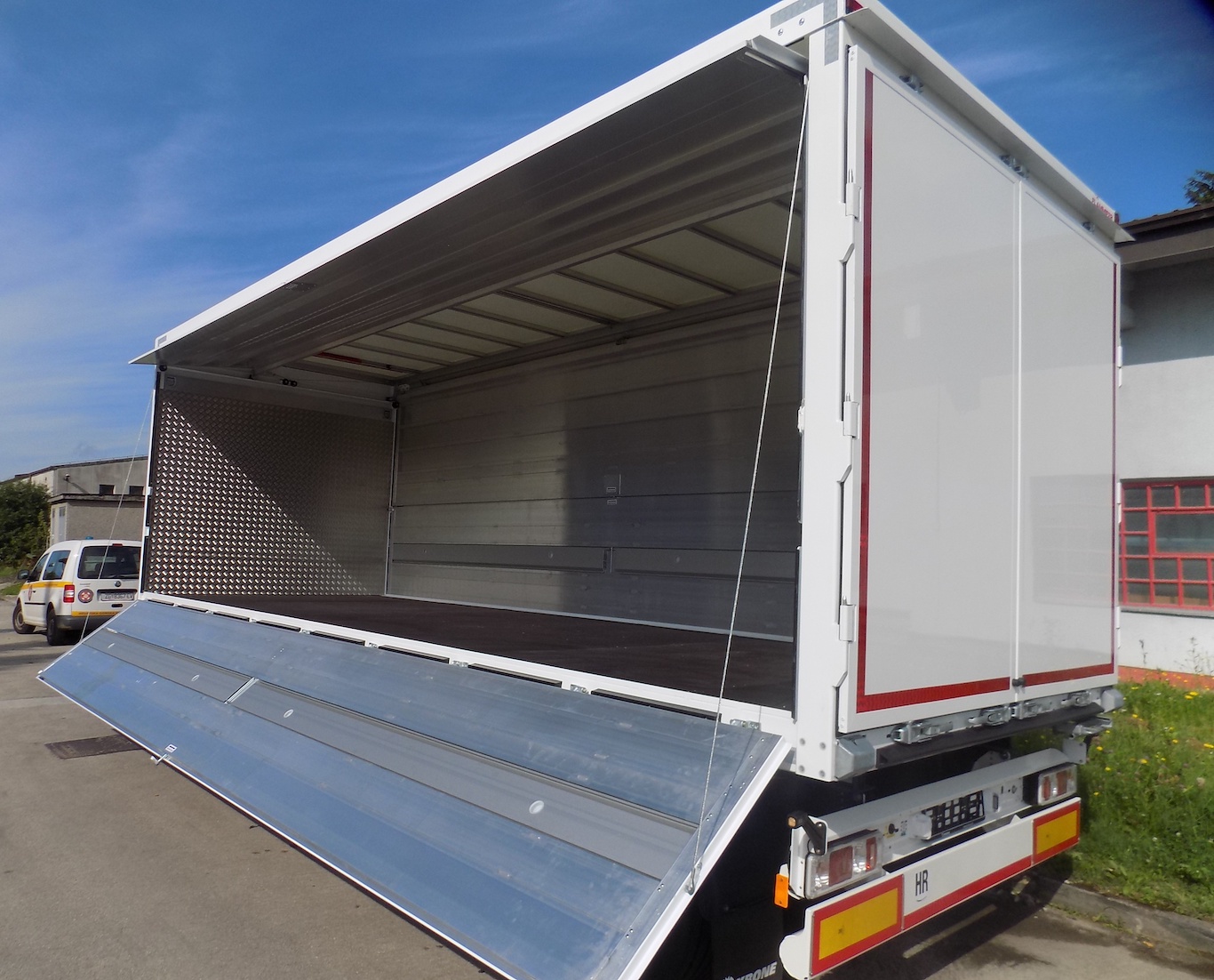 - Izvedba otklopna vrata (Swing Wall Door)-Robusna nadogradnja sa aluminijskim bočnim vratima prilagođena brzom otvaranju izatvaranju. Montaža na kamionsko podvozje ili prikolicu.-Aluminijske bočne stranice su opremljene stepenicama za lakši ulaz u teretni prostor.-Na stražnjem dijelu vozila mogućnost ugradnje dvokrilnih vrata i/ili utovarne rampe.